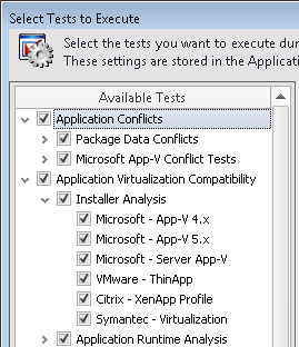 All of the tests in the Installer Analysis subcategory of the Application Virtualization Compatibility test category are always run each time that you run Application Virtualization Compatibility tests in Analyze.