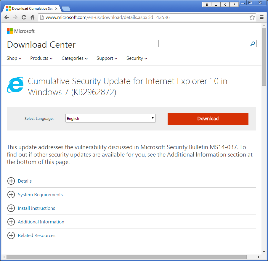Click the link in the Bulletin ID field. The Security Bulletin for that patch opens. In this example, Security Bulletin MS14-037 opens: