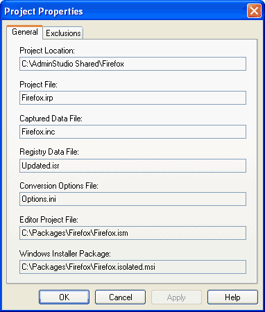 The General tab of the Project Properties dialog box displays information about the current Repackager project (.irp).