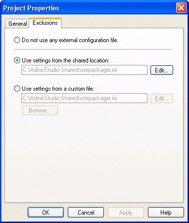 Use settings from the shared locationRepackager will use the settings contained in isRepackager.ini in the AdminStudio Shared directory (configured during installation). Use this option when you are working in a team environment where the exclusion list needs to be stored in a centralized location.