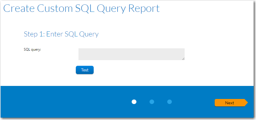 In the navigation bar, click Create Custom SQL Query Report on the Reports menu. The Step 1: Enter SQL Query panel of the Create Custom SQL Query Report page opens.