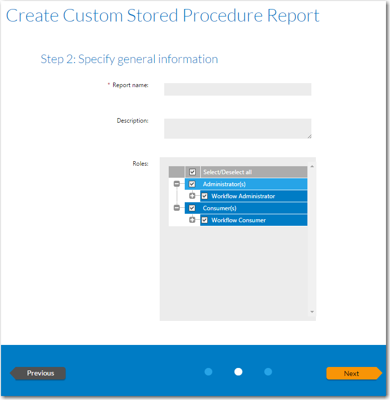You have the option of generating a Workflow Manager report using a stored procedure. A Custom Stored Procedure Report is a report on data generated by Workflow Manager that is defined by specifying a stored procedure.