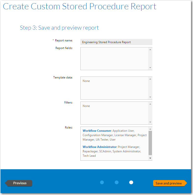 8. Click Next. The Step 3: Save and preview report panel opens.
