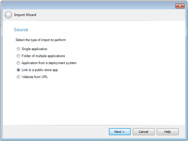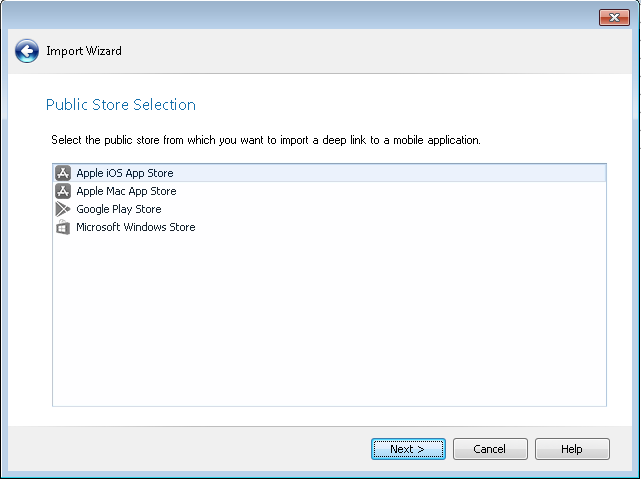 Select Link to a public store app and click Next. The Public Store Selection panel opens.