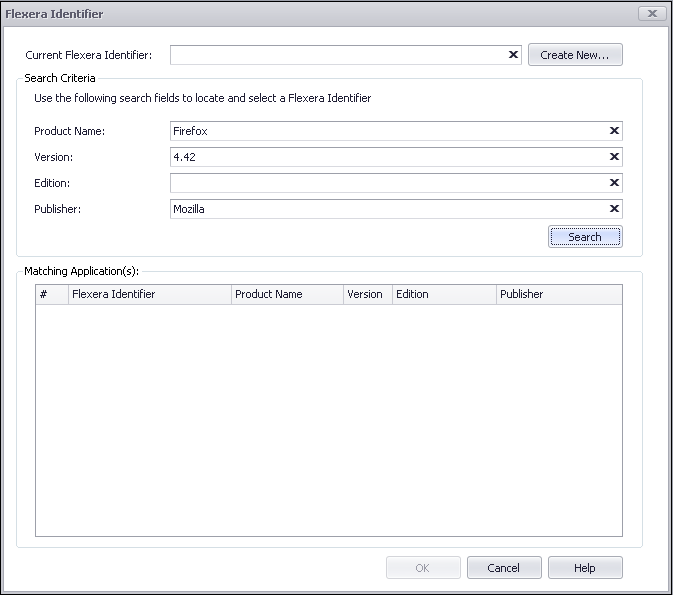 If an application still does not have an assigned Flexera Identifier, you can perform a manual search of the FlexNet Manager Suite Application Recognition Library, as described in Performing a Manual Search for a Flexera Identifier to attempt to identify an existing entry.