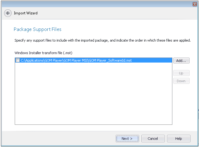 Windows Installer (.msi)Transform files (.mst)All of the .mst files that are in the same directory as the Windows Installer file you are importing are automatically listed, but only those .mst files that AdminStudio determines are probably applicable to this Windows Installer package are selected to be included in the import. If you do not want to import a selected .mst file, clear the selection. You can add additional transform files and specify the order that they will be applied, as described in Adding Additional Package Support Files and Ordering List.