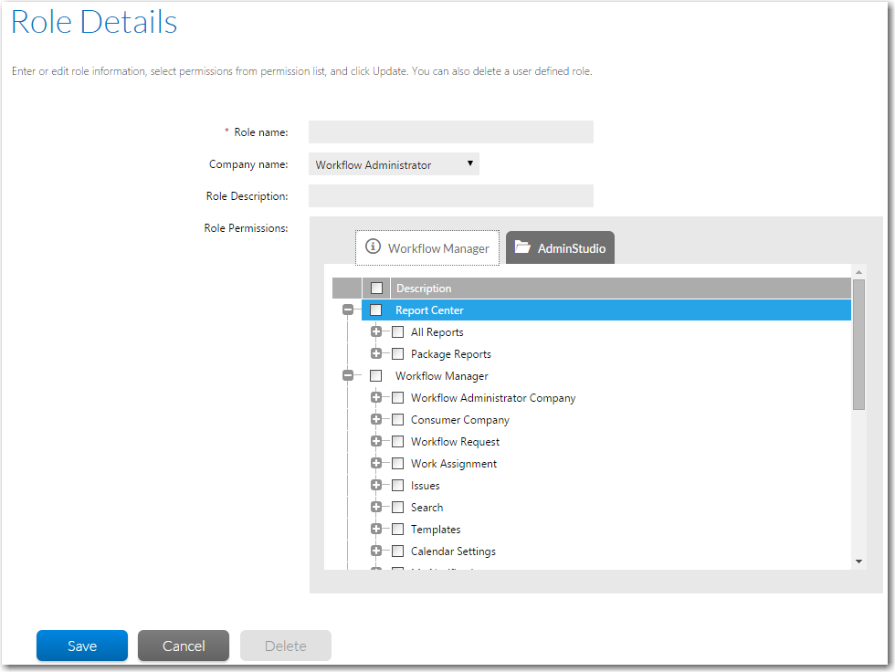 3. Enter details to identify the role, and assign appropriate permissions. For more information, see Role Details Page and Role Permission Lists.