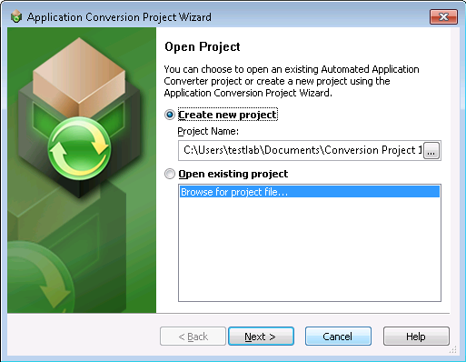 When you launch the Automated Application Converter, the Open Project dialog box opens, prompting you to either create a new project or open an existing project.