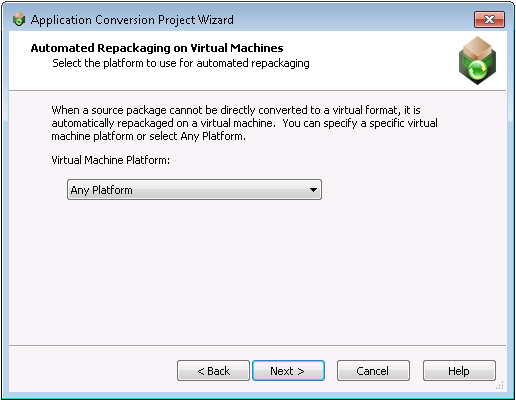 Click Next. The Automated Repackaging on Virtual Machines panel opens, prompting you to select the platform of the virtual machines that you want to use to perform automated repackaging during this conversion process.