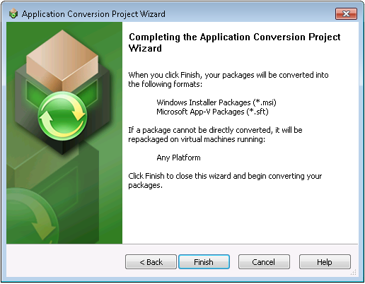 From the Virtual Machine Platform list, select a platform, or leave Any Platform selected, and click Next. The Application Conversion Project Wizard Complete panel opens.