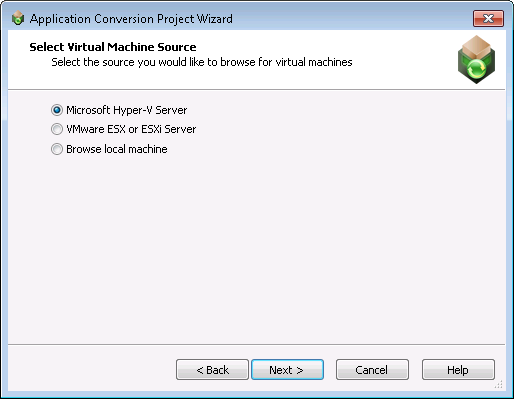Click Next. The Select Virtual Machine Source panel opens, prompting you to select the type of virtual machine that you are going to use for automated repackaging.