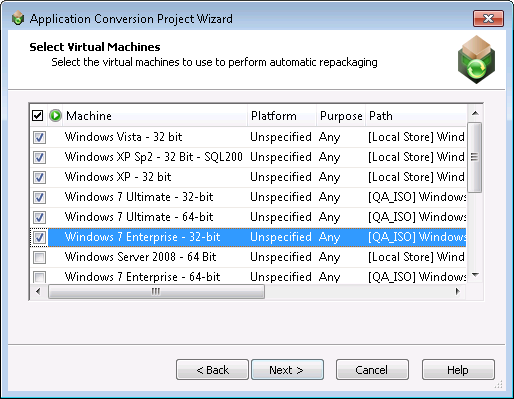 Optionally, if you want to limit the use of a virtual machine to either repackaging only or testing only, click in the Purpose column and select Repackaging or Testing from the list. The default value is Any.