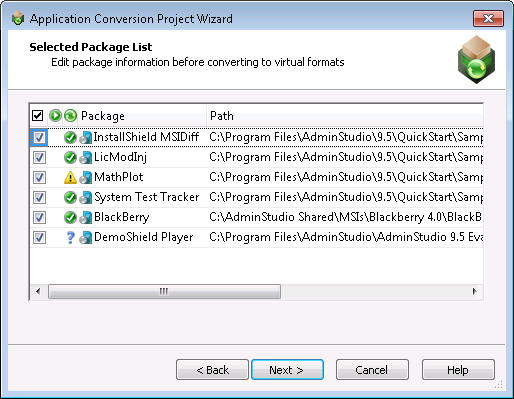 When you have finished this step, packages will be listed and selected on the Selected Package List panel, and an icon indicates each package’s virtualization readiness status.
