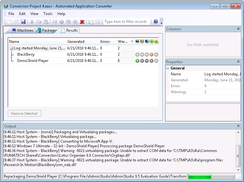 | Operation (copying to virtual machine, repackaging, or copying from virtual machine back to source location) is still being performed even though a warning was generated. View the results AdminStudio Automated Application Converter Log Report for detailed information on the errors encountered. | ||