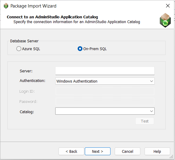 6. Select AdminStudio Application Catalog and click Next. The Connect to an AdminStudio Application Catalog panel opens. On the Connect to an AdminStudio Application Catalog panel, you have the following two options: