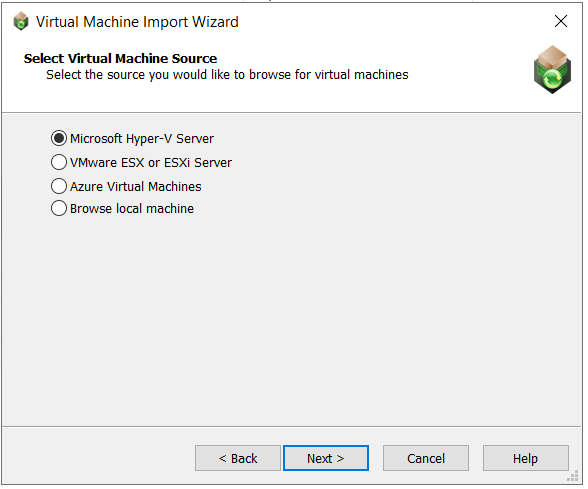 Microsoft Hyper-V ServerOn the Select Virtual Machine Source from Microsoft Hyper-V Server panel, enter the following information: Server Name—Enter the server name of the Microsoft Hyper-V Server that you want to connect to. Authentication—Select Windows Authentication if you want to use the credentials of the logged in user to login to the Hyper-V Server. Select Server Authentication if you want to connect to the Hyper-V Server using the specified User name and Password .