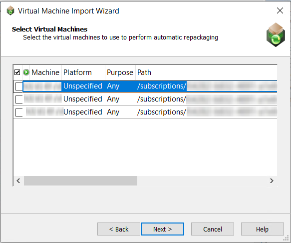 6. In the Select Virtual Machines panel, select the virtual machine images that you want to use to perform automated repackaging.