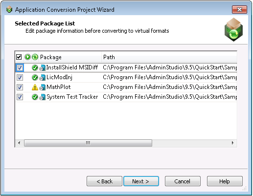 | Virtualization Readiness | When you add a package to the Selected Packages List panel, the Automated Application Converter does a quick check to identify that package’s virtualization readiness: whether the package can be virtualized directly or whether it requires repackaging before virtualization. An icon is displayed in this column to indicate the virtualization readiness: You can click on the icon in this column to override the Virtualization readiness status that was automatically been assigned to this package by the Automated Application Converter. The choices are: Ready —Package is ready to virtualize; no repackaging is required. Requires repackaging —Package must be repackaged before it can be successfully virtualized. Virtualization not supported —Automated Application Converter has determined that virtualization is not supported. Virtualization not recommended —Automated Application Converter has determined that this package is not recommended for virtualization. Unknown —The Automated Application Converter was unable to determine whether this package is ready to be virtualized directly or whether it requires repackaging. Packages with a status of Virtualization not supported will not be virtualized. In order to virtualize the package, you must first override the status and change it to Ready or Requires repackaging . You can click on the icon in this column to override the Virtualization readiness status that has automatically been assigned to this package. |